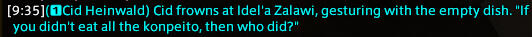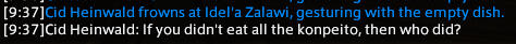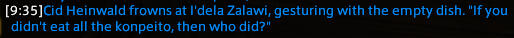 /p Cid frowns at Idel'a Zalawi, gesturing with the empty dish. "If you didn't eat all the konpeito, then who did?"